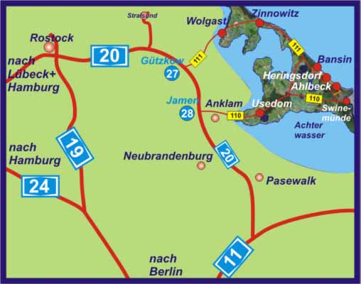 28 (Jamen) über die Bundesstrassen 111 bzw. 110 Richtung Bansin. Nach dem